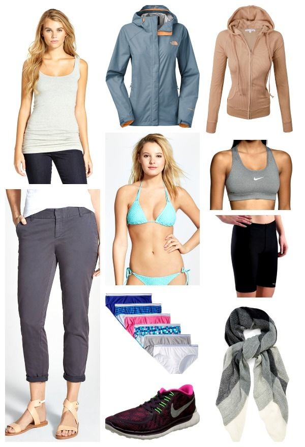 stretch chinos | tank top | thermal jacket | rain jacket | scarf | Sporty Hipster Panty | sports bra | lycra shorts | running shoes | bathing suit